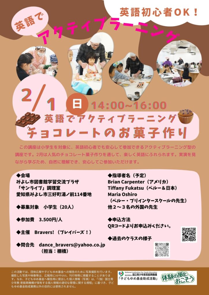 2月、みよし市にて小学生向けの英語アクティブラーニング講座「チョコレートのお菓子作り」を開催しました。 当日は多くの子どもたちが参加し、英語を使いながら楽しくお菓子作りに挑戦しました。